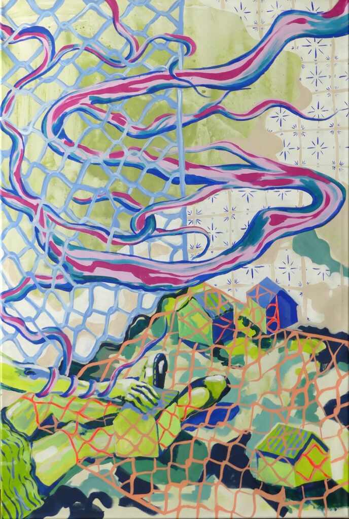 Ce que je voulais dire ici, c’est essentiellement la beauté des frontières ouvertes tout en conservant l’identité et le caractère unique de chaque pays. J’ai beaucoup voyagé dans l’UE et en dehors, et il y a vraiment un sentiment d’être le bienvenu et de se sentir en sécurité. Il y a actuellement une très grave crise du logement au Portugal, ce qui est assez triste, mais j’ai aussi le sentiment que faire partie de l’UE m’ouvre des portes, je sais que je ne suis pas dans un espace clos, mais que je fais partie de quelque chose de plus grand. J’ai donc peint une fille plaçant des logements à l’intérieur et à l’extérieur d’une clôture. Cependant, cette clôture ne ferme rien, car elle est ouverte. Les arbres entrelacés dans la clôture représentent la mémoire et l’identité. Je peins toujours les arbres comme un symbole de résistance et de mémoire collective, l’idée que des générations et des générations ont diffusé leur culture et que l’identité et la culture ne peuvent être effacées. Ces arbres traversent librement les frontières. Parallèlement, j’ai également représenté des personnages très typiques du Portugal, en référence à mon pays. J’ai choisi des carreaux blancs et bleus car ils sont chargés d’histoire, depuis les influences mauresques jusqu’au pays que nous sommes aujourd’hui.