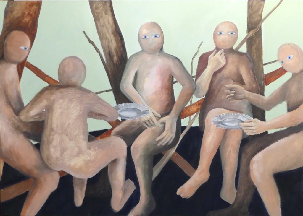 Le tableau représente un groupe de personnes assises autour d’une table qui brille par son absence. Cette absence n’est pas seulement une anomalie visuelle, mais une métaphore délibérée qui est au cœur de l’œuvre. Faisant référence à la crise humanitaire qui sévit actuellement à la frontière entre la Pologne et la Biélorussie, à la périphérie de l’Union européenne, la composition devient un commentaire poignant sur les contradictions du projet européen.